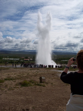 Au fil de notre promenade, nous avons constaté le formidable effet des conditions géologiques sur l’eau. L’on voyait bouillonner, siffler et jaillir du sol des jets de vapeur dont certains atteignent des températures de 200 degrés, chauffés qu’ils sont par le magma souterrain. À Gullfoss (qui signifie chutes dorées), l’eau tombait en puissantes cascades. Au lieu du Geysir – le premier geyser du nom – nous avons vu l’eau jaillir dans les airs avec une force spectaculaire à toutes les cinq minutes. Cette puissance fournit  de la chaleur et de l’électricité à travers le pays, et on lui doit également l’immense nuage de cendres qui avait forcé l’interruption du trafic aérien en Europe l’an dernier.